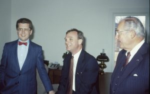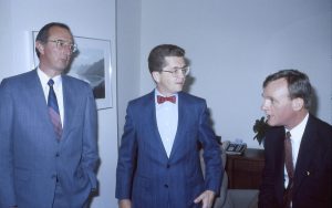 One man jesturing to two others. Lincoln Home NHS- Paul Findley and Michel VIP visit, 117 Finley, Michel, visit One man jesturing to two others. Lincoln Home NHS- Paul Findley and Michel VIP visit, 117 Finley, Michel, visit