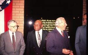 Four men standing in front of Farewell address. Lincoln Home NHS- VIP Findley and Michel Visit award, visit Four men standing in front of Farewell address. Lincoln Home NHS- VIP Findley and Michel Visit award, visit