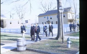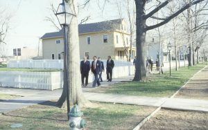 Distant shot of four men walking on board walk in front of Arnold house. Lincoln Home NHS- VIP Findley and Michel Visit award, visit, tour Distant shot of four men walking on board walk in front of Arnold house. Lincoln Home NHS- VIP Findley and Michel Visit award, visit, tour