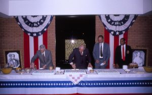 Six men standing behind table for photograph. Lincoln Home NHS- VIP Findley and Michels Visit award, visit, ceremony Six men standing behind table for photograph. Lincoln Home NHS- VIP Findley and Michels Visit award, visit, ceremony
