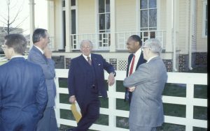 Five men standing at white fence. Lincoln Home NHS- VIP Findley and Michel Visit award, visit, tour Five men standing at white fence. Lincoln Home NHS- VIP Findley and Michel Visit award, visit, tour