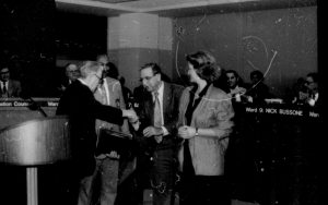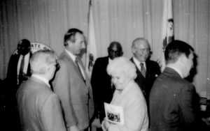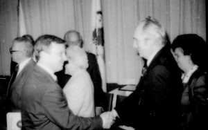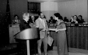 Man congratulating lady in front of City Council. Lincoln Home NHS- City Council Ollie Christmas Award, 133 Award, program Man congratulating lady in front of City Council. Lincoln Home NHS- City Council Ollie Christmas Award, 133 Award, program