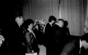 People standing i front of state seal and curtain. Lincoln Home NHS- Paul Findley and Michel VIP visit, 129 Finley, Michel, visit, reception People standing i front of state seal and curtain. Lincoln Home NHS- Paul Findley and Michel VIP visit, 129 Finley, Michel, visit, reception