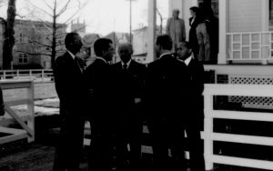 Men standing by white fence. Lincoln Home NHS- Paul Findley and Michel VIP visit, 115 Finley, Michel, tour, visit Men standing by white fence. Lincoln Home NHS- Paul Findley and Michel VIP visit, 115 Finley, Michel, tour, visit