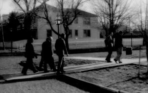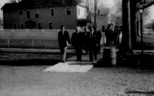Group of men walking on board walk into street.. Lincoln Home NHS- Paul Findley and Michel VIP visit, 127 Finley, Michel, visit, tour Group of men walking on board walk into street.. Lincoln Home NHS- Paul Findley and Michel VIP visit, 127 Finley, Michel, visit, tour