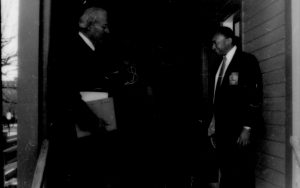 Two men standing on steps. Lincoln Home NHS- Paul Findley and Michel VIP visit, 127 Finley, Michel, visit, tour Two men standing on steps. Lincoln Home NHS- Paul Findley and Michel VIP visit, 127 Finley, Michel, visit, tour