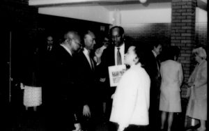 Three men talking to lady in white coat. Lincoln Home NHS- Paul Findley and Michel VIP visit, 125 Finley, Michel, visit Three men talking to lady in white coat. Lincoln Home NHS- Paul Findley and Michel VIP visit, 125 Finley, Michel, visit