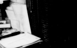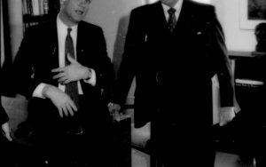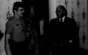 Two men standing by desk. Lincoln Home NHS- Paul Findley and Michel VIP visit, 115 Finley, Michel, tour, visit Two men standing by desk. Lincoln Home NHS- Paul Findley and Michel VIP visit, 115 Finley, Michel, tour, visit