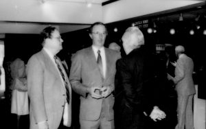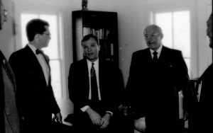 Three men standing, talking. Lincoln Home NHS- Paul Findley and Michel VIP visit, 125 Finley, Michel, visit Three men standing, talking. Lincoln Home NHS- Paul Findley and Michel VIP visit, 125 Finley, Michel, visit