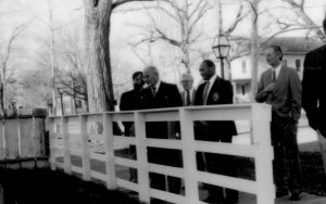 Group of men standing behind white fence. Lincoln Home NHS- Paul Findley and Michel VIP visit, 115 Finley, Michel, tour, visit Group of men standing behind white fence. Lincoln Home NHS- Paul Findley and Michel VIP visit, 115 Finley, Michel, tour, visit