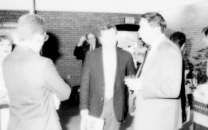 Three men in forefront talking. Lincoln Home NHS- Paul Findley and Michel VIP visit, 122 Finley, Michel, visit, reception Three men in forefront talking. Lincoln Home NHS- Paul Findley and Michel VIP visit, 122 Finley, Michel, visit, reception