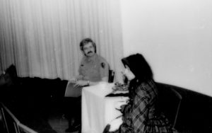 Two people sittting at table in front of screen. Lincoln Home NHS- Paul Findley and Michel VIP visit, 123 Finley, Michel, visit, reception Two people sittting at table in front of screen. Lincoln Home NHS- Paul Findley and Michel VIP visit, 123 Finley, Michel, visit, reception