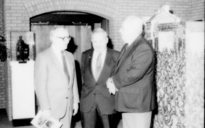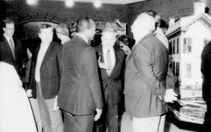 Three men conversing. Lincoln Home NHS- Paul Findley and Michel VIP visit, 121 Finley, Michel, visit, reception Three men conversing. Lincoln Home NHS- Paul Findley and Michel VIP visit, 121 Finley, Michel, visit, reception