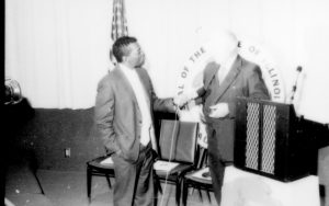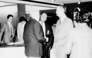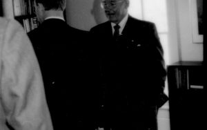 Two men conversing. Lincoln Home NHS- Paul Findley and Michel VIP visit, 121 Finley, Michel, visit, reception Two men conversing. Lincoln Home NHS- Paul Findley and Michel VIP visit, 121 Finley, Michel, visit, reception