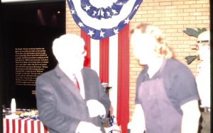 Man standing in front of screen talking to a lady. Lincoln Home NHS- Paul Findley Recognition Award, 4314 Finley, award Man standing in front of screen talking to a lady. Lincoln Home NHS- Paul Findley Recognition Award, 4314 Finley, award