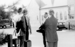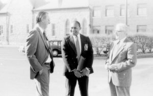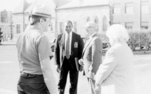 Three men standing in street. Lincoln Home NHS- Paul Findley and Michel VIP visit, 123 Finley, Michel, visit Three men standing in street. Lincoln Home NHS- Paul Findley and Michel VIP visit, 123 Finley, Michel, visit