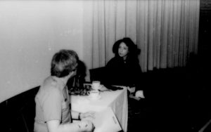 Two people sittting at table in front of screen. Lincoln Home NHS- Paul Findley and Michel VIP visit, 123 Finley, Michel, visit, reception Two people sittting at table in front of screen. Lincoln Home NHS- Paul Findley and Michel VIP visit, 123 Finley, Michel, visit, reception