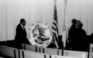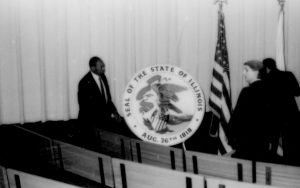 Man standing next to Ill. state seal. Lincoln Home NHS- Paul Findley and Michel VIP visit, 123 Finley, Michel, visit, reception Man standing next to Ill. state seal. Lincoln Home NHS- Paul Findley and Michel VIP visit, 123 Finley, Michel, visit, reception