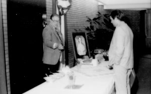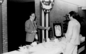Man behind table talking to another man. Lincoln Home NHS- Paul Findley and Michel VIP visit, 123 Finley, Michel, visit, reception Man behind table talking to another man. Lincoln Home NHS- Paul Findley and Michel VIP visit, 123 Finley, Michel, visit, reception