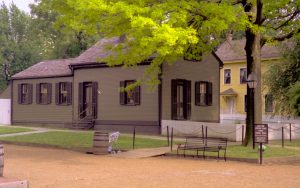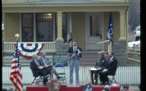 Five men on speakers platform in front of Cook house Lincoln Home NHS- Cook House Re-opening Cook, ceremony Five men on speakers platform in front of Cook house Lincoln Home NHS- Cook House Re-opening Cook, ceremony