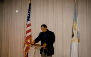 Man speaking from podium in VC. Lincoln Home NHS- Cook House Contractor Award, 5 contractor, award, Cook Man speaking from podium in VC. Lincoln Home NHS- Cook House Contractor Award, 5 contractor, award, Cook