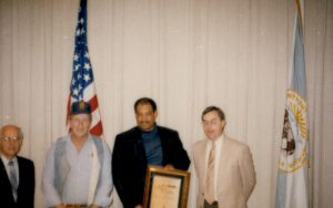 Award being presented in VC, four men standing. Lincoln Home NHS- Cook House Contractor Award, 5 contractor, award, Cook Award being presented in VC, four men standing. Lincoln Home NHS- Cook House Contractor Award, 5 contractor, award, Cook