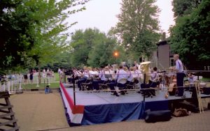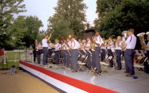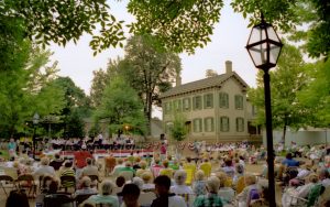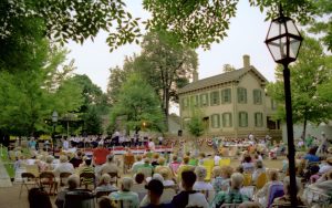 Public seated, band on platform and Lincoln home in background. Lincoln Home NHS- Coast Guard Band Concert, 267618 concert, Coast Guard Public seated, band on platform and Lincoln home in background. Lincoln Home NHS- Coast Guard Band Concert, 267618 concert, Coast Guard