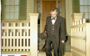Lincoln impersonator decending front steps of home. Lincoln Home NHS- Coast Guard Band Concert concert, Coast Guard Lincoln impersonator decending front steps of home. Lincoln Home NHS- Coast Guard Band Concert concert, Coast Guard