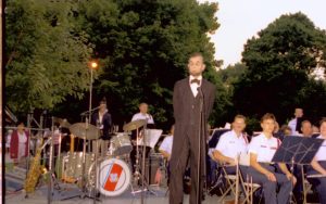 Lincoln impersonator standing on state speaking. Lincoln Home NHS- Coast Guard Band Concert concert, Coast Guard Lincoln impersonator standing on state speaking. Lincoln Home NHS- Coast Guard Band Concert concert, Coast Guard