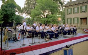 Public seated, band on platform and Lincoln home in background. Lincoln Home NHS- Coast Guard Band Concert, 267618 concert, Coast Guard Public seated, band on platform and Lincoln home in background. Lincoln Home NHS- Coast Guard Band Concert, 267618 concert, Coast Guard