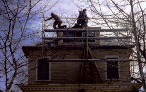 Men working on scaffolding at Cook house. Lincoln Home NHS restoration; Cook house. Men working on scaffolding at Cook house. Lincoln Home NHS restoration; Cook house.