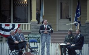 Five men on speakers platform in front of Cook house Lincoln Home NHS- Cook House Re-opening Cook, ceremony Five men on speakers platform in front of Cook house Lincoln Home NHS- Cook House Re-opening Cook, ceremony