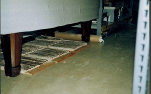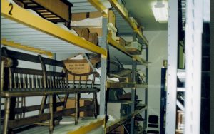 Art Wall/storage racks installed on the South wall of the Arnold Barn storage facility Lincoln Home NHS, CRS Collection Move, Arnold Barn, Roll N11, exp 7, sheet 2 of 5 Arnold Barn, move, storage
