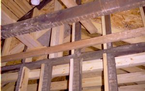 Room 105 and 104, Photo taken looking West, from room 104 into room 105 (addition). Detail of roof (joists, frames, rafters, etc.) Lincoln Home NHS, roll N9 Corneau, Arnold Barn, Sprigg renovation