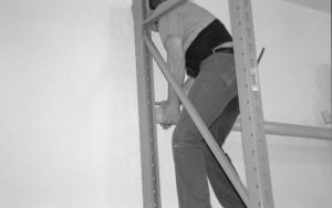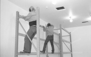 storage shelves built and installed along the North wall in the Arnold Barn facility Lincoln Home NHS, CRS Collection Move, North wall, Arnold Barn, Roll N11, exp 1, sheet 1 of 5 Arnold Barn, move, storage
