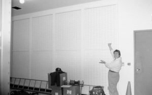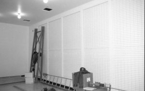 Art Wall/storage racks installed on the South wall of the Arnold Barn storage facility Lincoln Home NHS, CRS Collection Move, Arnold Barn, Roll N11, exp 8, sheet 2 of 5 Arnold Barn, move, storage