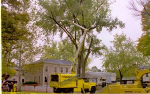 South face of west side of 8th St; Cutting down trees at Southwest corner of 8th/Jackson intersection in prep of moving Corneau House to front of lot. In background can see Sprigg under construction Lincoln Home NHS, Roll N5, exp 1, sheet 1 of 2 LIHO, Sprigg, Corneau