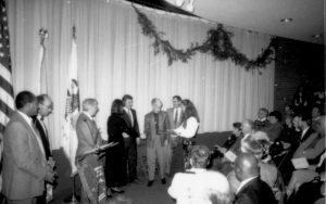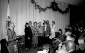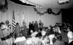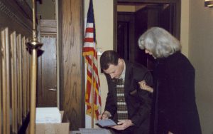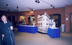 Lincoln's Birthday - visitors chat and shop before the lectures at the Visitor Center. Bookstore Manager Dave Mull and IT Specialist Joe Sortor chat behind Lincoln Home stand-alone exhibit near the office. Bookstore in background left. Looking Northeast from main area. Lincoln's Birthday, visitors, staff, Eastern National Bookstore, exhibit, Visitor Center