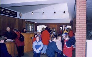 Lincoln's Birthday - School group visiting site during activities. Volunteer ? assists lady in red coat. Ranger Christy Lindberg works behind the desk. Looking Northwest from main area Lincoln's Birthday, Visitor Center, school group, staff, volunteers, visitors