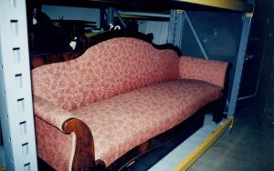 Settee held in storage; N3 storage space Lincoln Home NHS, 1998 CRS Collection Move, Roll N7, exp 21 sheet 7 of 9 Arnold Barn, storage room, furnishings, sofa