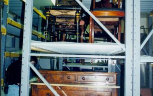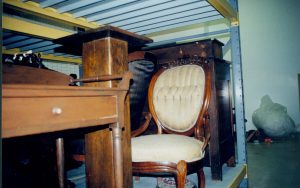 Chairs, bureau, etc. held in storage. K storage rack Lincoln Home NHS, 1998 CRS Collection Move, Roll N7, exp 24 sheet 9 of 9 Arnold Barn, storage room, furnishings