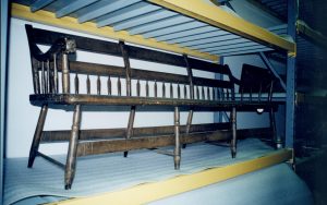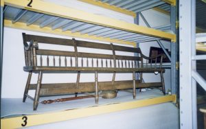 Lincoln associated bench and bed warmer in new storage location Lincoln Home NHS, CRS Artifacts Move, Roll N13, exp 1 sheet 1 of 6 Arnold Barn, storage room, furnishings, bench