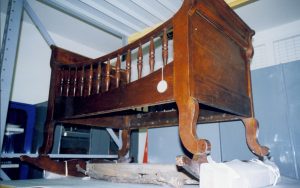 Lincoln associated (?) crib in new storage location Lincoln Home NHS, CRS Artifacts Move, Roll N13, exp 2 sheet 1 of 6 Arnold Barn, storage room, furnishings, crib