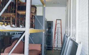 Whatnot, podium, chairs, etc. held in collection; K3 storage space Lincoln Home NHS, 1998 CRS Collection Move, Roll N7, exp 23 sheet 8 of 9 Arnold Barn, storage room, furnishings