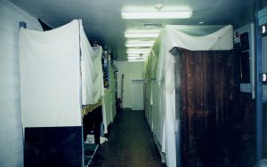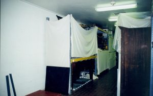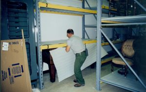 Looking at South wall and South entrance door (back is against North wall); view is along aisle between 4 foot racks Lincoln Home NHS, 1998 CRS Collection Move, Roll N7, exp 4 sheet 2 of 9 Carriage House, storage room