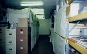 Looking twoards North wall, along aisle between 4 foot racks Lincoln Home NHS, 1998 CRS Collection Move, Roll N7, exp 5 sheet 2 of 9 Carriage House, storage room