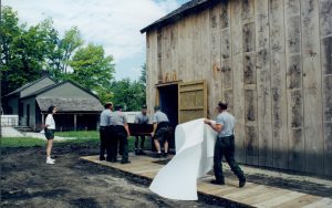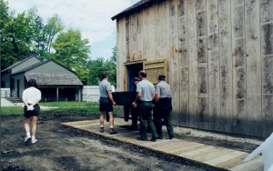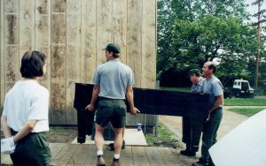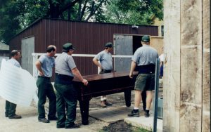 Members of maintenance mving piano into its new position in the Arnold Barn storage space. Photo taken from South aisle, looking at the North wall (A3 storage space) Lincoln Home NHS, 1998 CRS Collection Move, Roll N7, exp 16 sheet 6 of 9 Arnold Barn, storage room