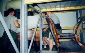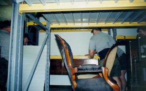 Members of maintenance mving piano into its new position in the Arnold Barn storage space. Photo taken from South aisle, looking at the North wall (A3 storage space) Lincoln Home NHS, 1998 CRS Collection Move, Roll N7, exp 15 sheet 5 of 9 Arnold Barn, storage room