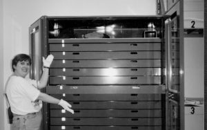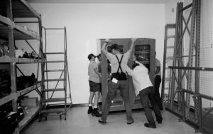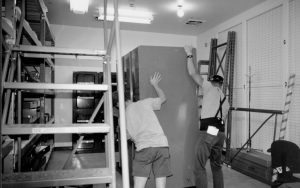 Moving 2nd of the large gray storage cabinets into the new storage area Lincoln Home NHS, CRS Collection Move, Facing East Wall, Roll N10, exp 7 sheet 2 of 7 Arnold Barn, storage