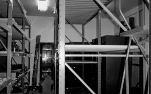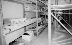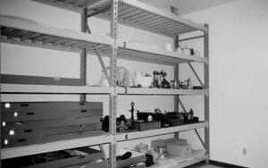 North wall storage shelves with artifacts Lincoln Home NHS, CRS Collection Move, Facing Northeast corner, Roll N10, exp 6 sheet 2 of 7 Arnold Barn, storage, artifacts